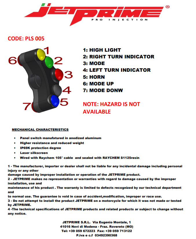 JetPrime upravljački prekidač za Ducati Panigale 1199/R/S (2012-2017) u Street verziji nudi poboljšano rješenje za vozače koji traže preciznu kontrolu i veću funkcionalnost. Opremljen s 7 tipki, ovaj upravljački prekidač omogućava brze reakcije i još precizniju kontrolu tijekom vožnje. Upravljački prekidač se lako zamjenjuje metodom „Plug & Play“ na originalnom upravljačkom prekidaču.